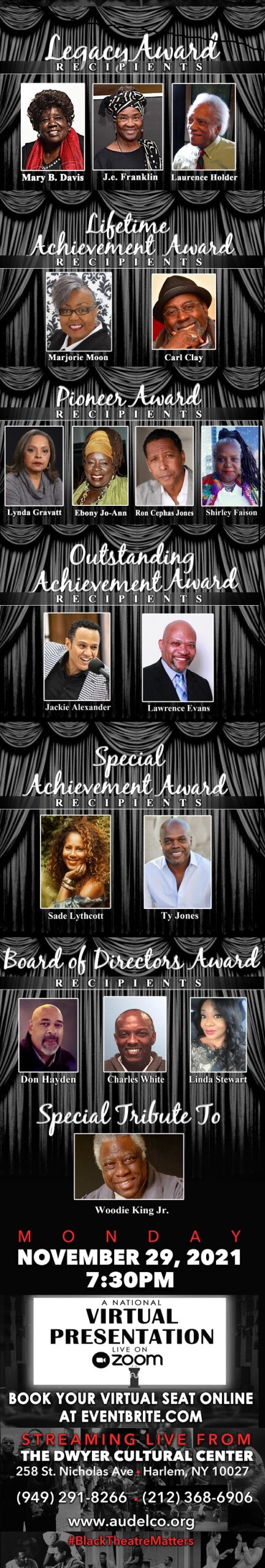 AUDELCO AWARDS 2021 Featuring Honorees… 𝗧𝗵𝗶𝘀 𝗳𝗿𝗲𝗲 𝗲𝘃𝗲𝗻𝘁 𝘄𝗶𝗹𝗹 𝗯𝗲 𝘀𝘁𝗿𝗲𝗮𝗺𝗲𝗱 𝘃𝗶𝗮 𝗭𝗼𝗼𝗺. To b𝗼𝗼𝗸 𝘆𝗼𝘂𝗿 𝘃𝗶𝗿𝘁𝘂𝗮𝗹 𝘀𝗲𝗮𝘁 𝗮𝗻𝗱 𝗿𝗲𝗰𝗲𝗶𝘃𝗲 𝘆𝗼𝘂𝗿 𝗹𝗶𝗻𝗸, 𝗥𝗦𝗩𝗣 𝗮𝘁 Eventbrite today! >>https://bit.ly/AUDELCO2021RSVPThe event can also be viewed via 𝗙𝗮𝗰𝗲𝗯𝗼𝗼𝗸 𝗟𝗶𝘃𝗲: https://www.facebook.com/audelco/live/ & 𝗬𝗼𝘂𝗧𝘂𝗯𝗲 𝗟𝗶𝘃𝗲: https://youtu.be/pu7dhJL7fps.We can’t wait to see you there!#audelco #blacktheatermatters #AUDELCOAWARDS2021For a list of the Nominees for the 49th Annual Vivian Robinson AUDELCO Awards click here.Click here to join AUDELCO now!